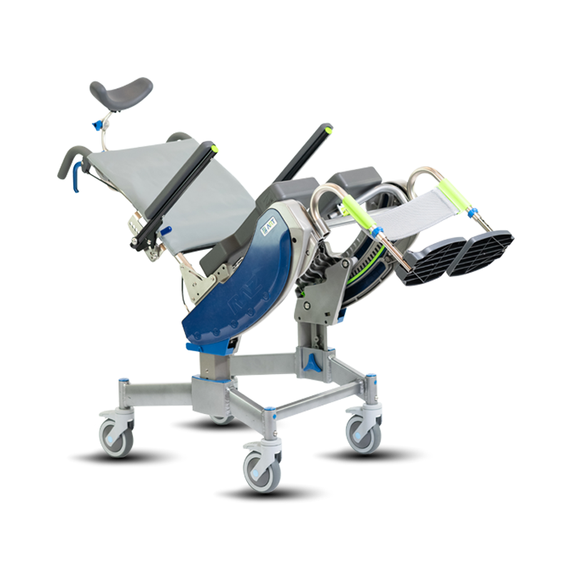 Confeccionada en material inoxidable, con sistema de basculación TILT en el espacio que conserva el Centro de Gravedad del paciente logrando asi un posicionamiento correcto y un fácil accionamiento desde el gatillo actuador situado en manija de empuje. Asiento contorneado en espuma soft lo que permite un confortable posicionamiento al momento de la higiene, el mismo cuenta con un sistema de alineación isquio-esquial (IPAS) que proporciona la correcta alineación de la pelvis con una variación de hasta 5cm de ajuste en profundidad. Respaldo elaborado en material impermeable con seis correas de ajuste que nos permite la correcta tensión necesaria de la zona dorso-lumbo-sacra. Posee una regulación fija de 90° a 95° de reclinación. Par de controles laterales de tronco rebatibles, confeccionados en poliuretano inyectado ajustables en altura y profundidad con memoria para lograr el contacto total con el paciente. Apoya brazo rebatible íntegramente almohadillado. Apoya pies de pedanas individuales, desmontable, rebatible, extraíble y regulable en altura con soporte de pantorrillas. Control cefálico con apoyo suboccipital/occipital confeccionado en material de espuma soft con un brazo de doble articulación que permite infinitas regulaciones en profundidad y altura adecuada a cada necesidad. Sistema de basculación Tilt mediante dos ejes baricéntricos que permiten una angulación de 90° hasta 135° sin modificar el Centro de Gravedad del paciente. Ruedas delanteras y traseras macizas de 12.7cm con doble bloqueo de dirección accionado mediante pedal actuador con frenos en las cuatro ruedas. Cinturón pélvico de dos puntos. Cubeta orinal con tapa de fácil extracción. El chasis de la silla posee una abertura posterior que permite el fácil ingreso de la silla al inodoro y ante sanitarios sobreelevados, el chasis de las ruedas, se puede rebatir para darle una altura mayor a la silla sanitaria.